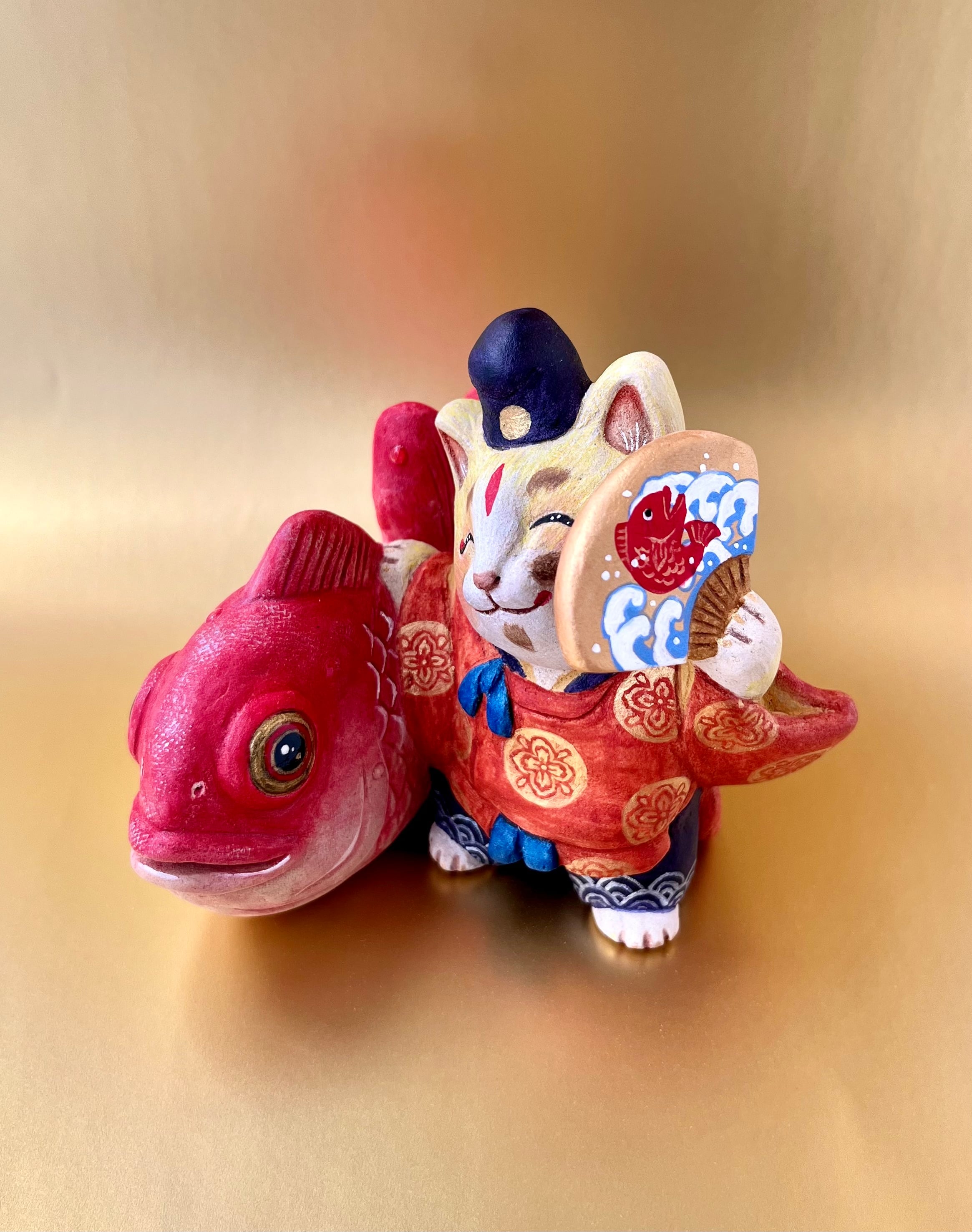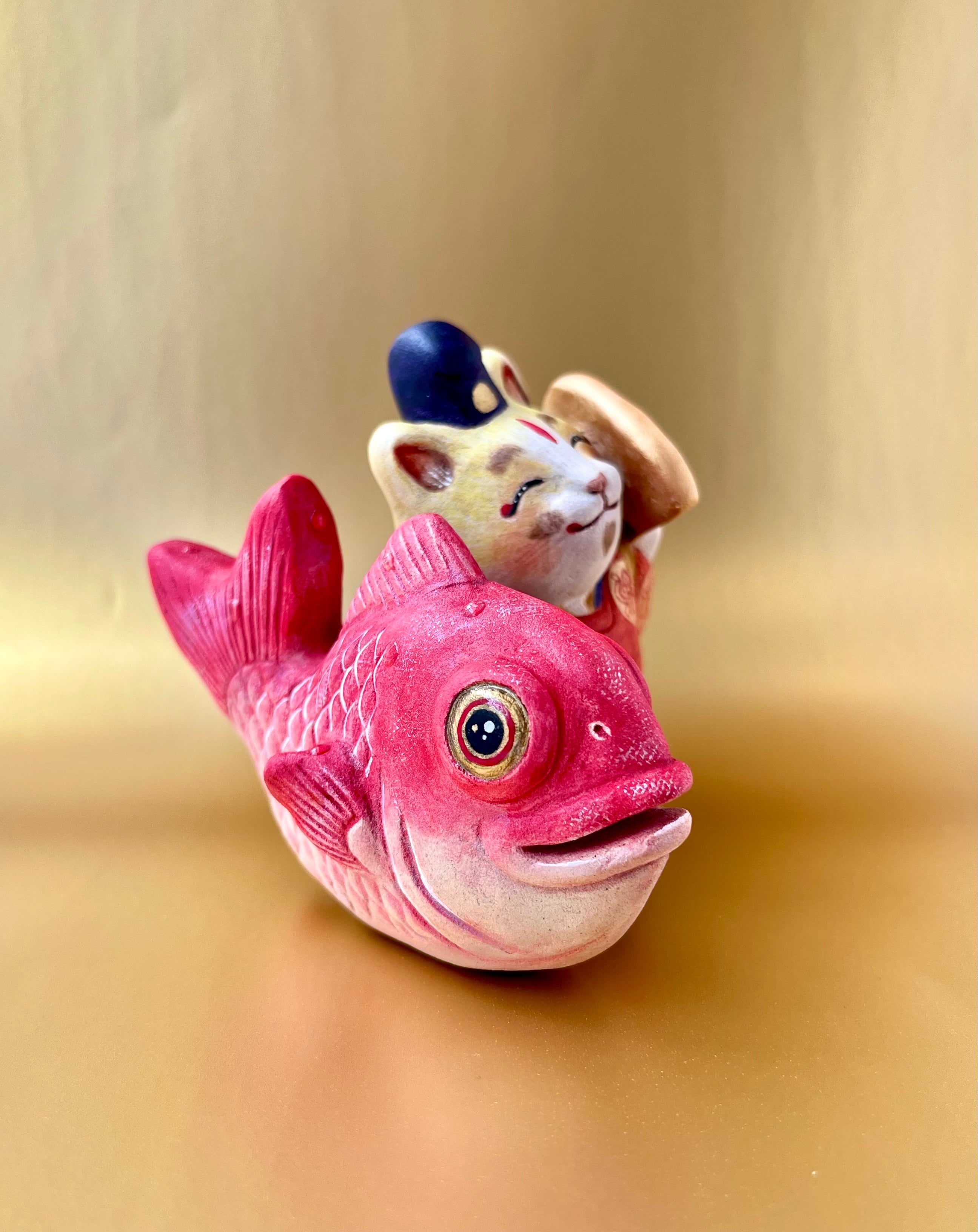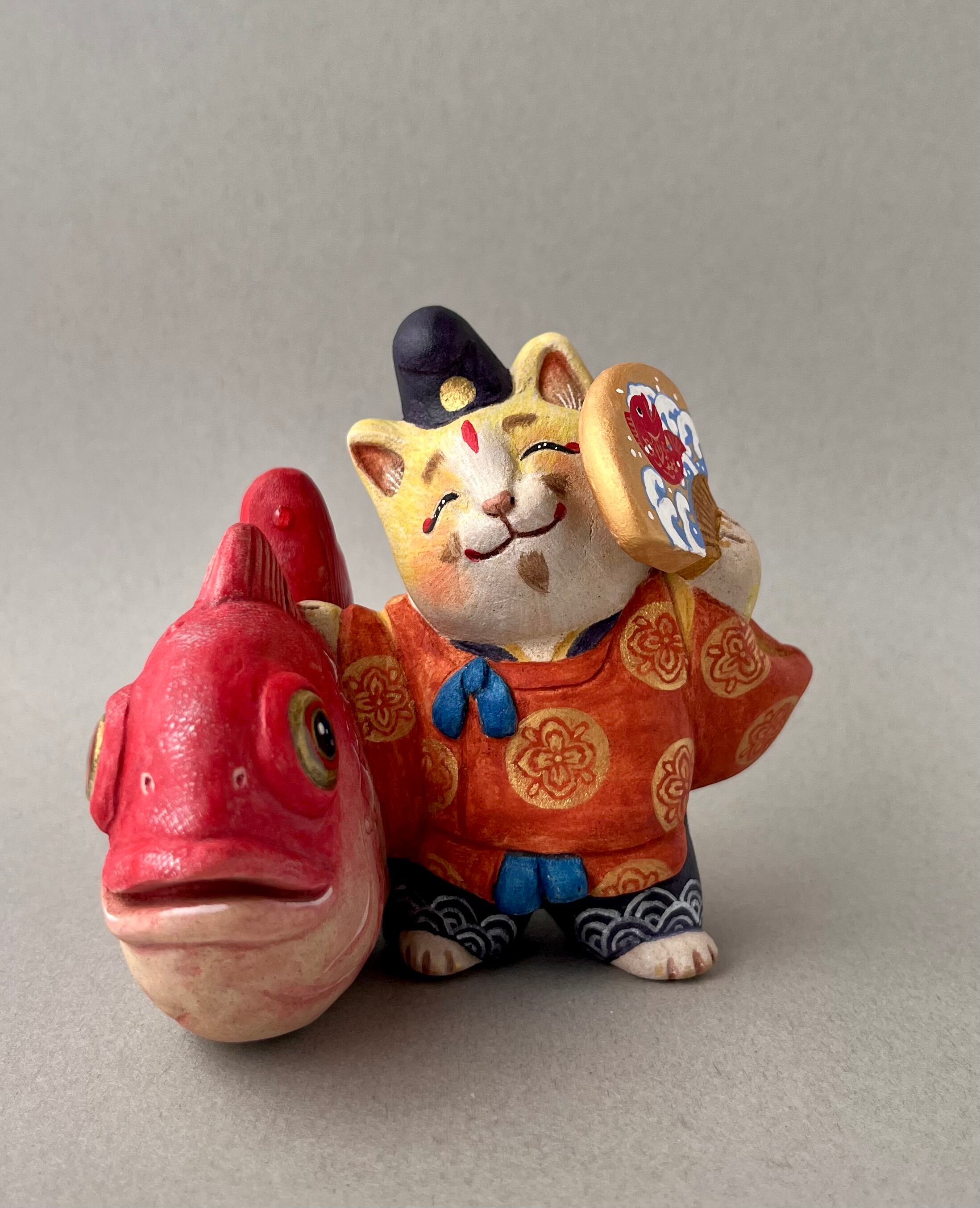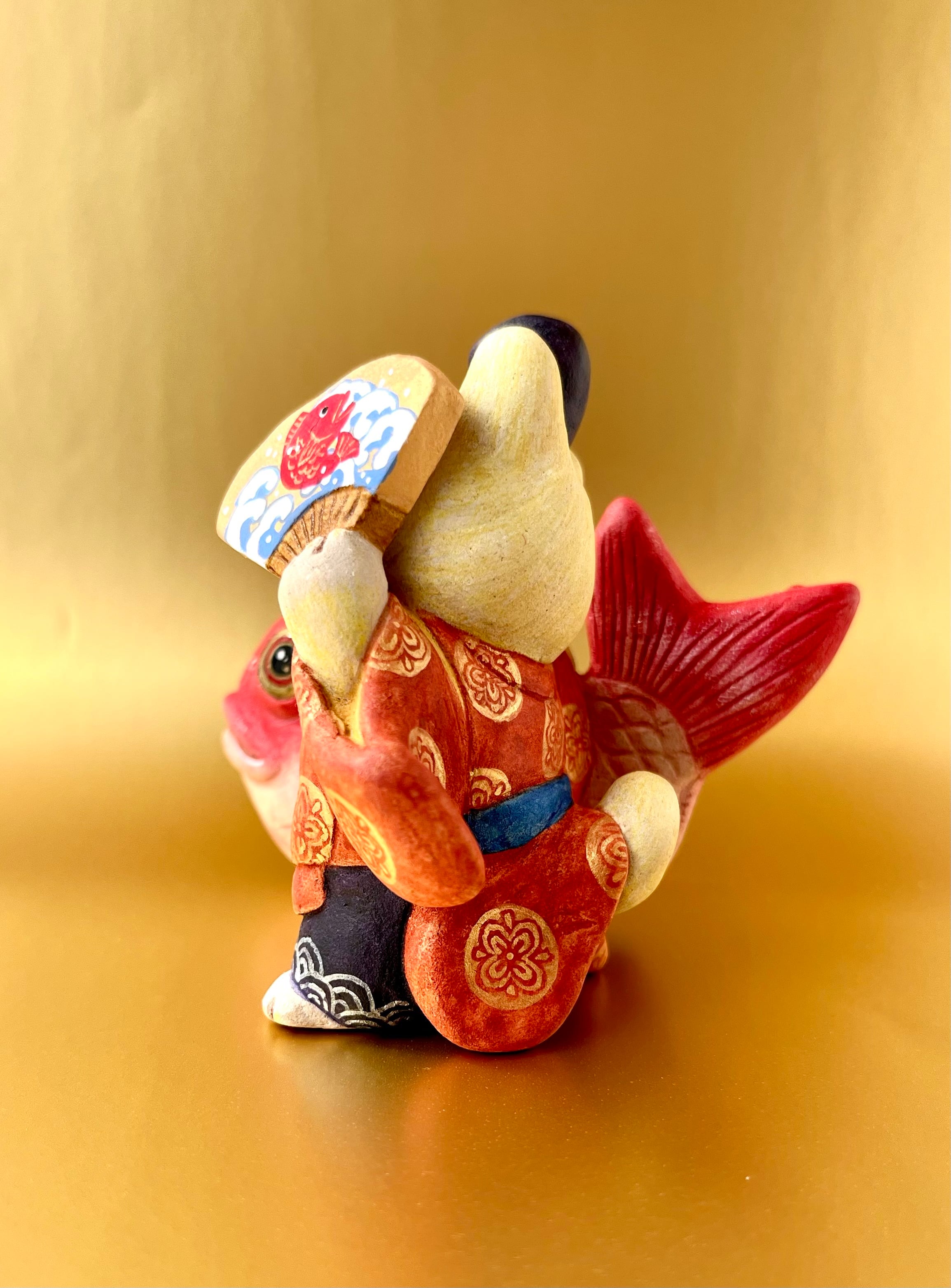民俗芸能の一つで、大漁を祈って七福神の「恵比寿様」に扮して舞う「恵比寿舞」をモチーフにしました。正月などのおめでたい時期に舞われるので、鯛を強調してみました。