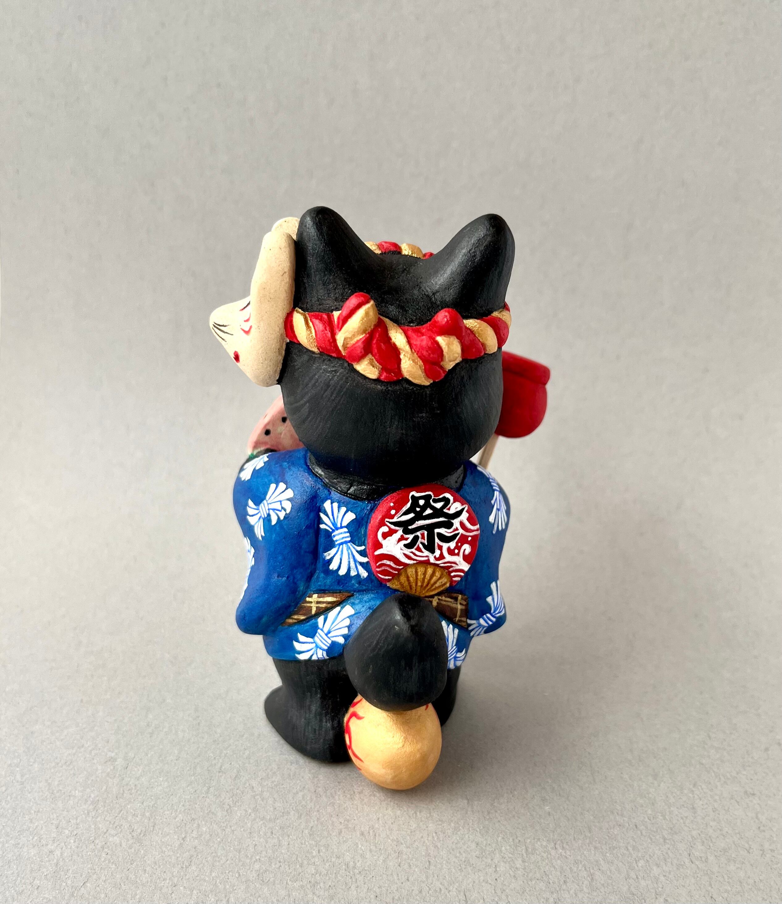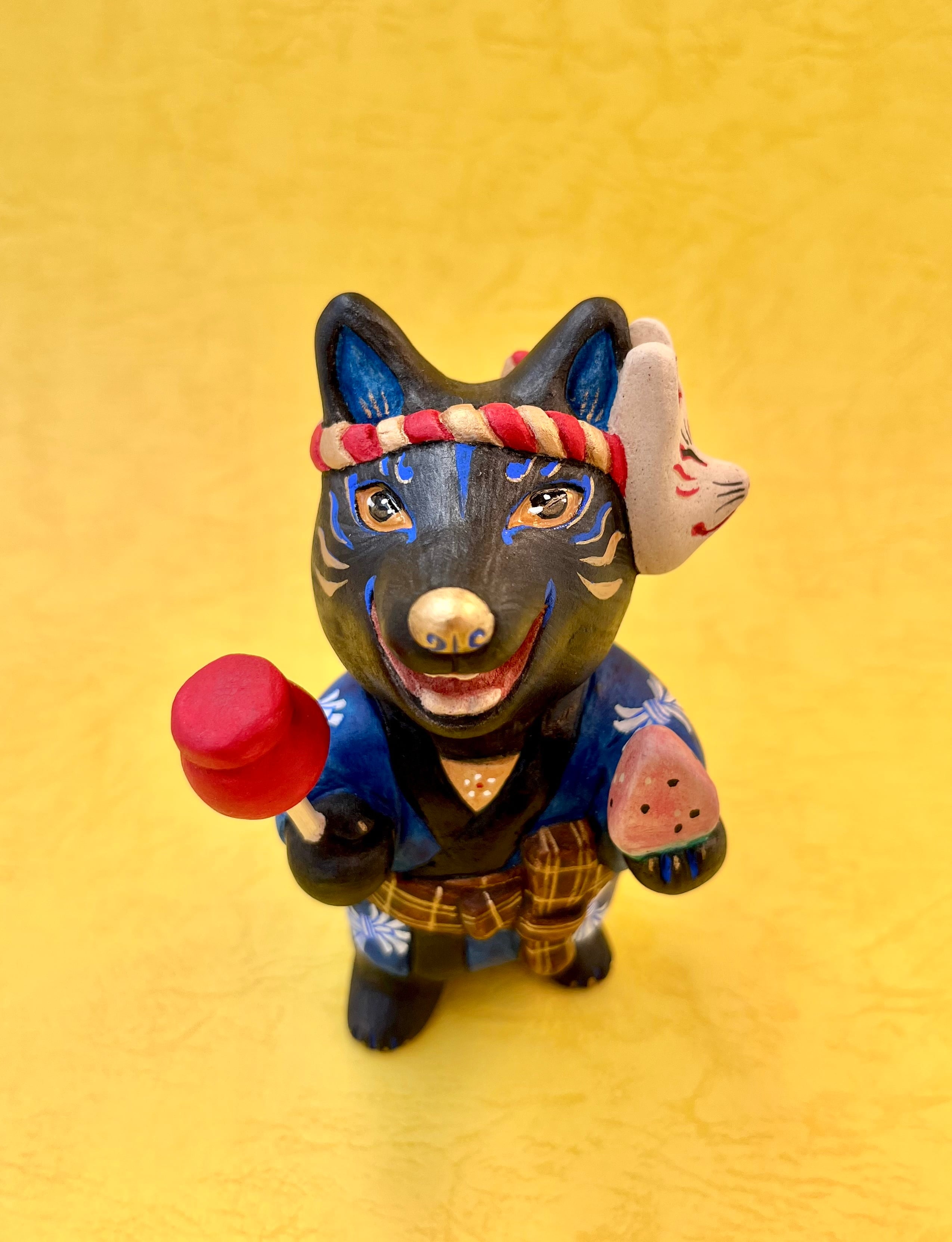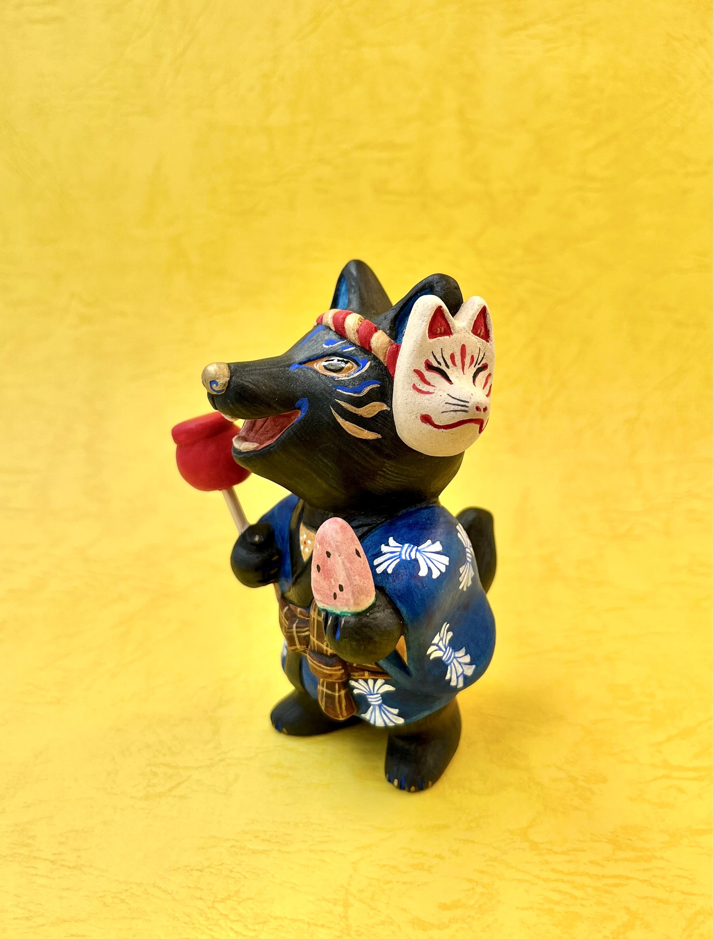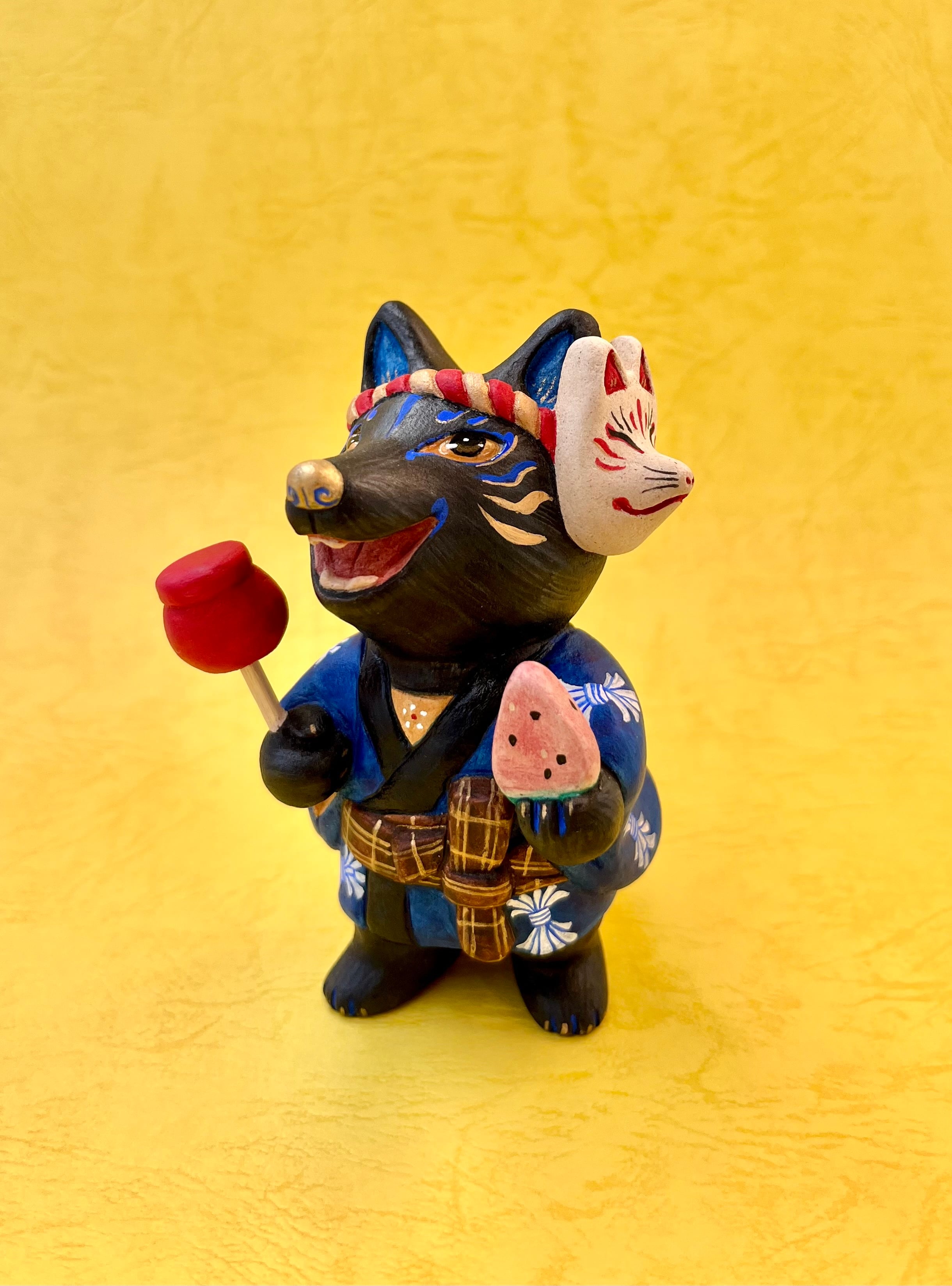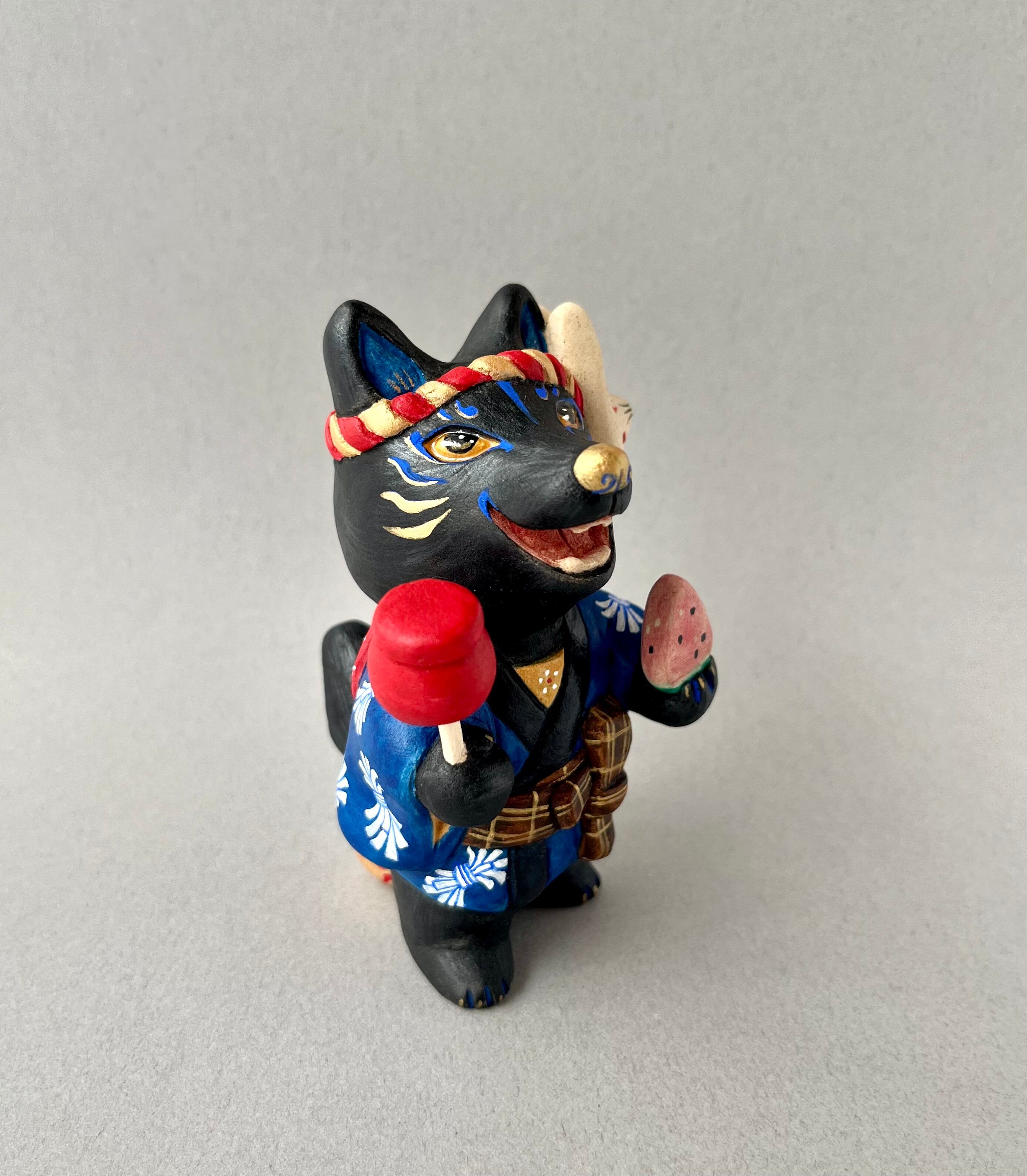 黒い狐は霊的な守護者や知恵の象徴とされています。りんご飴とスイカを交互に楽しもうとしている様子です。