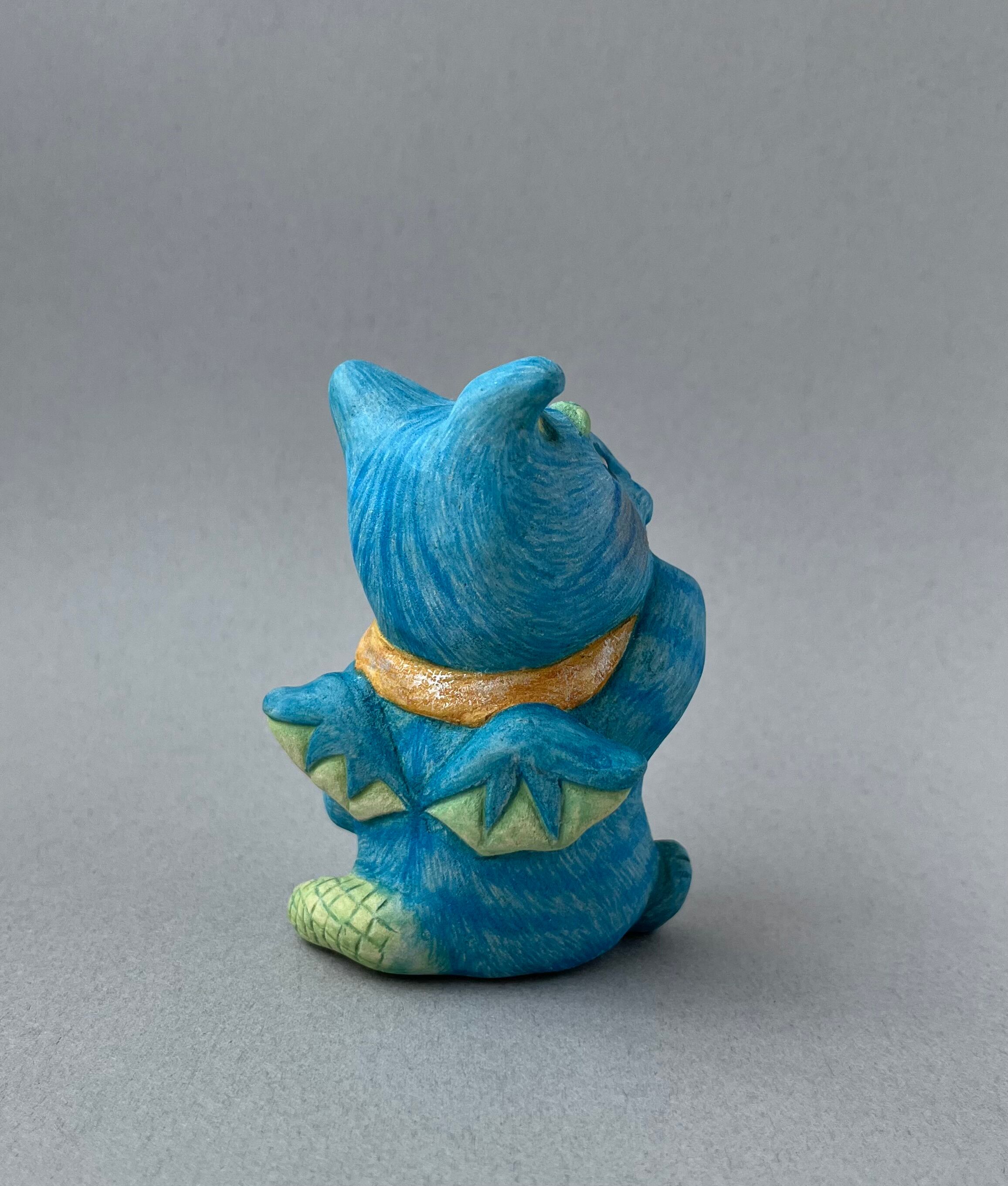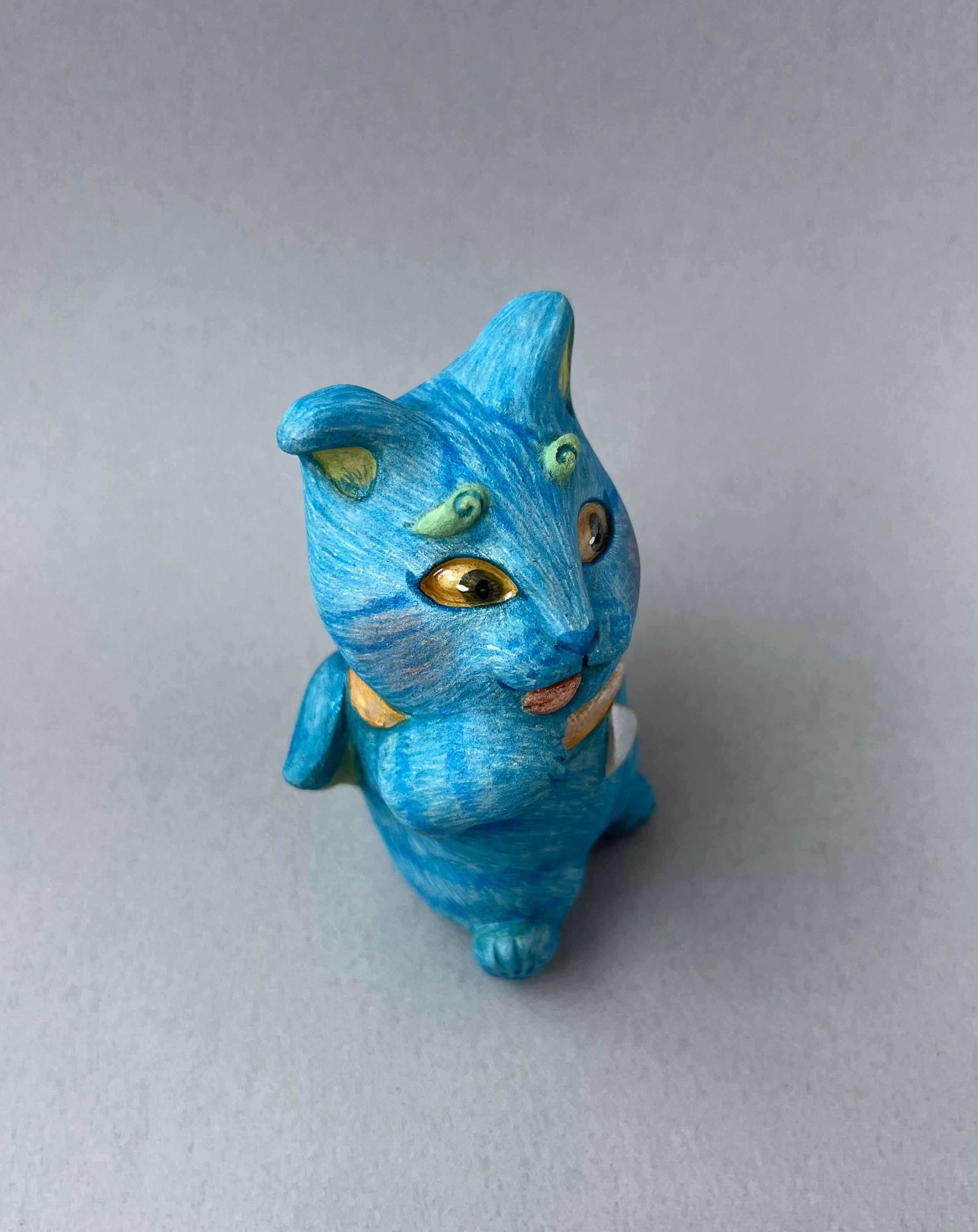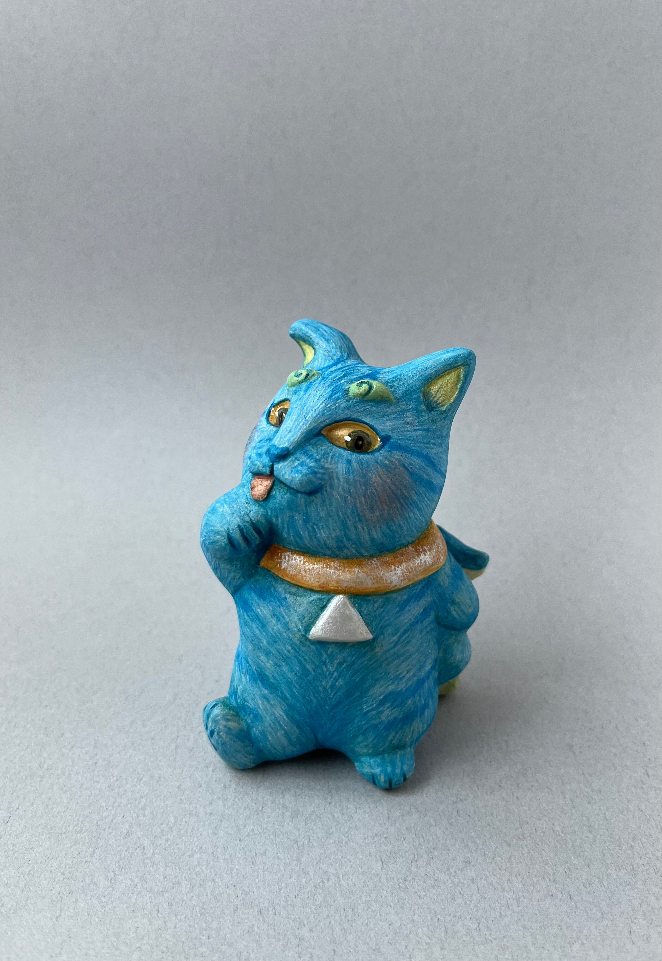 日本最古の神社とも言われる幣立神宮に奉納されている五色人の面というものがあります。かつて世界に存在していた5種類の人種を表しているとされていて、その中の青人をモチーフにした青猫です。