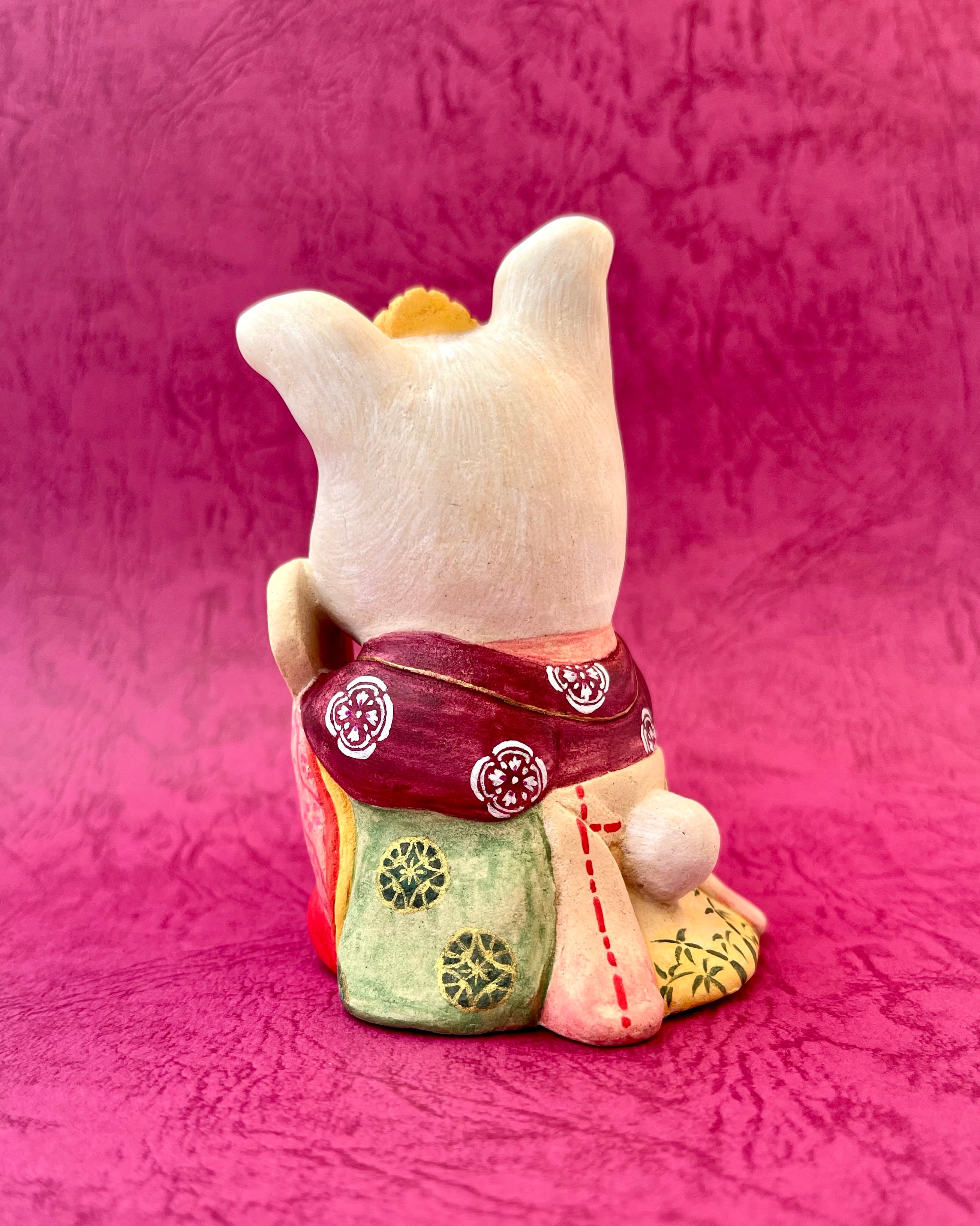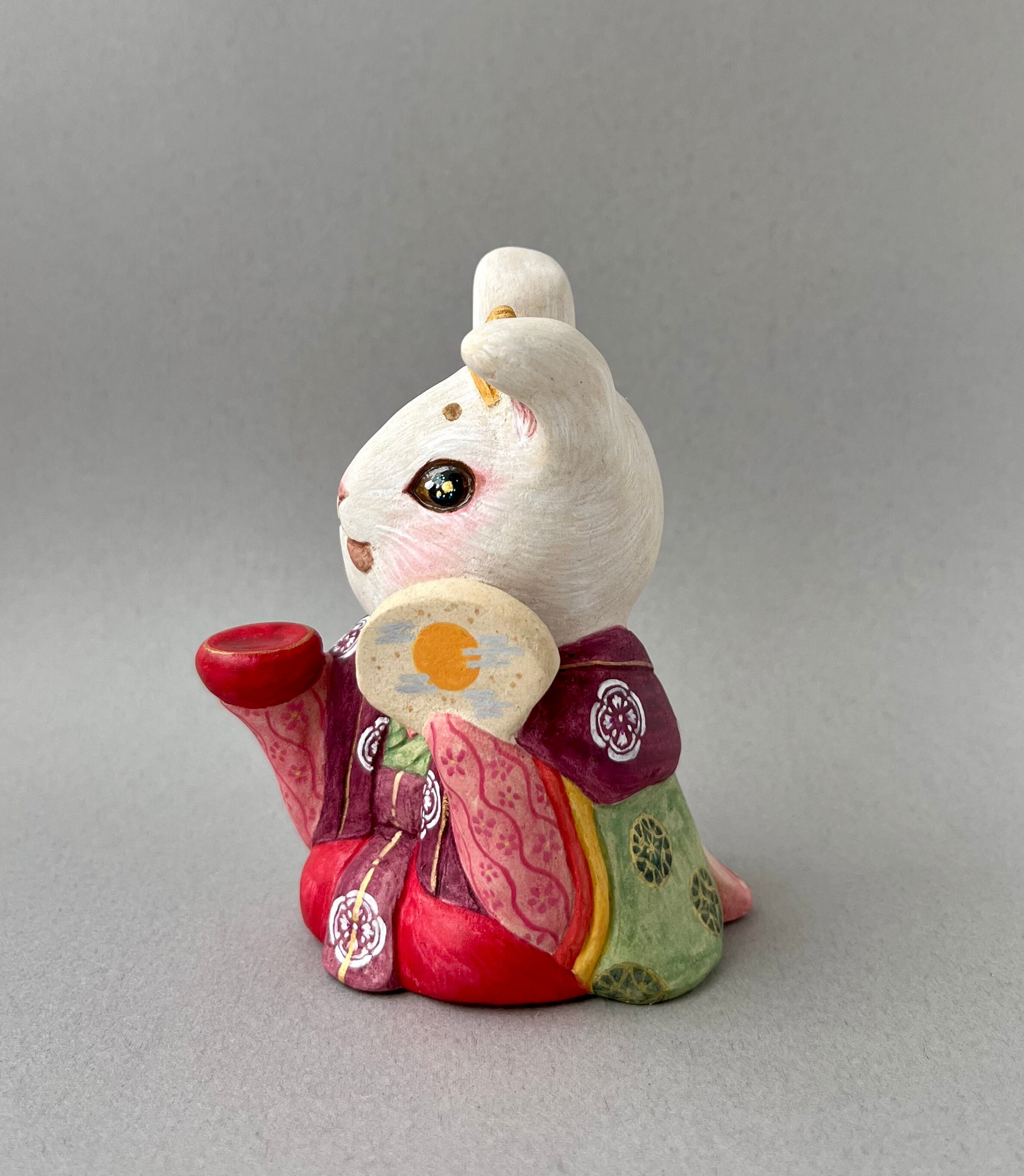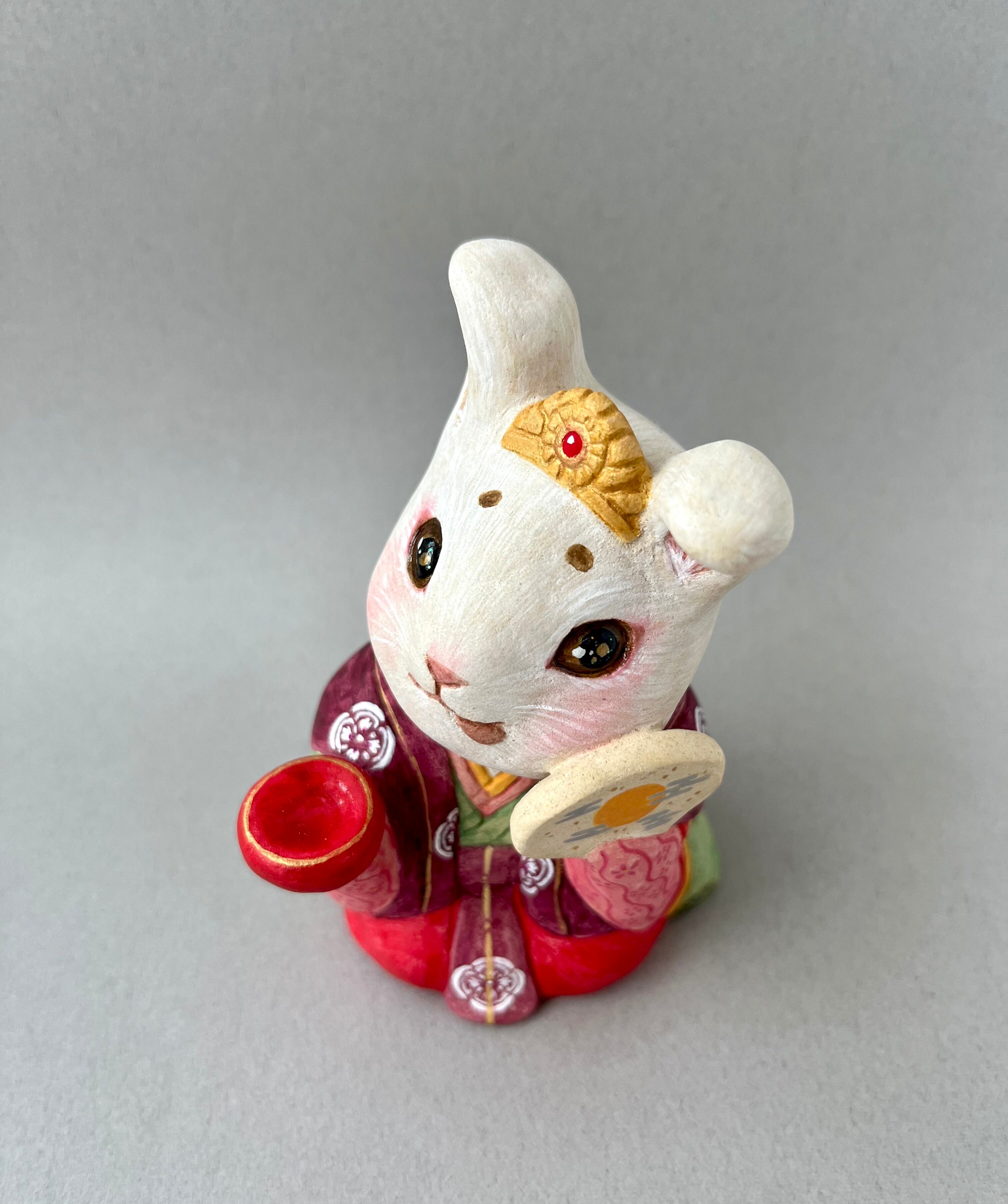 竹取物語でお馴染みの神様。月ではなく故郷の東北に帰ったとか、鬼の一族であるという説もあり、兎は鬼とも言われています。月見酒を楽しんで、酔っ払っている姿にしました。